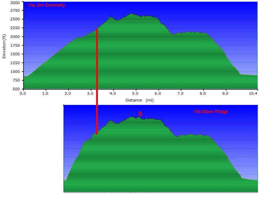There has always been another well marked trail junction for the Jim Donnelly Trail, from Steer Ridge at a point about 1/2 mile below the Spike Jones Trail. It supposedly joined to Middle Steer Ridge near the bottom. If you took it coming down, you quickly discovered that it became indistinct and very hard to follow after a while, and you would probably wind up bushwhacking your way down the last part to get to the bottom.