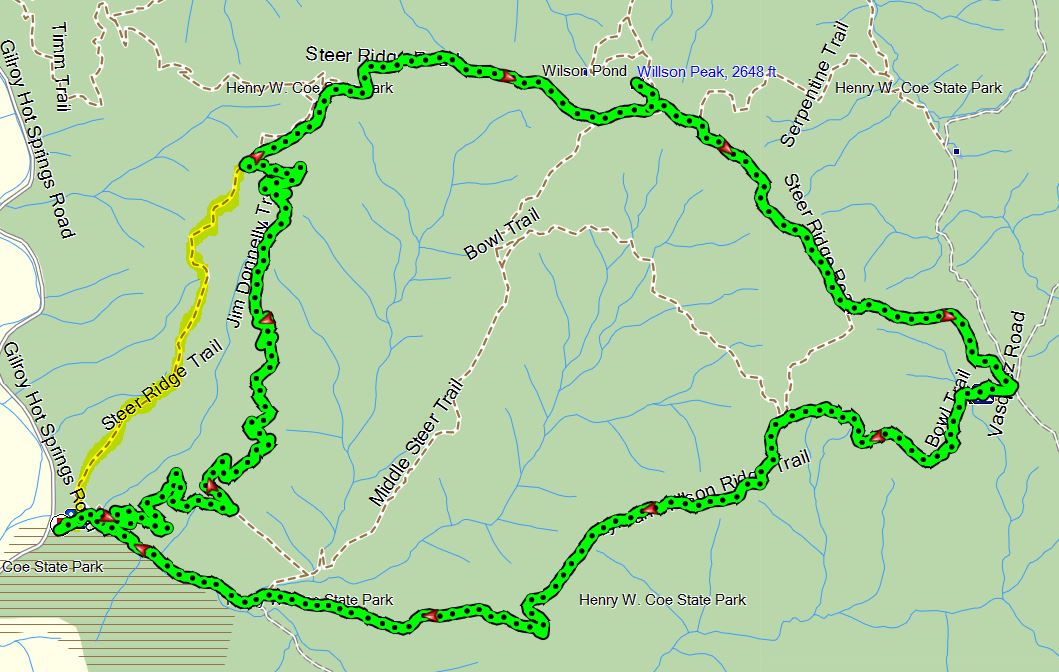 The Jim Donnelly trail adds about 2 miles to the loop, but makes the grade to reach the top much more reasonable, probably not over 10%, where the first mile of the Steer Ridge Trail probably averages near 20%. The sections following the junction point connected by the red line don't exactly match up mostly because of slight differences in the paths followed near Willson Peak at the top. Also, for the earlier hike I walked a short distance down the Serpentine Trail to scope out the valley (marked at "S").