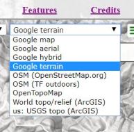 The map is initially brought up with "Google terrain" shown. This list is actually much smaller than the total list GPS Visualizer makes available. Currently, we don't need topo maps of Europe or nautical charts (we've waded a few times but it hasn't got THAT serious).